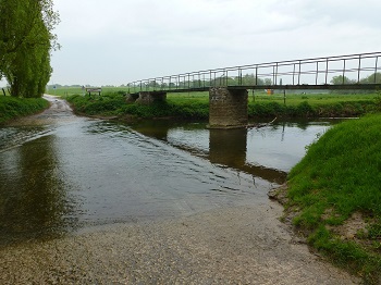 En passant devant le château et à la sortie du village, il y a une petite route en descente sur la droite, tout au bout nous apercevons un gué ! Certaines voitures s'y engagent mais l'eau est vraiment haute.