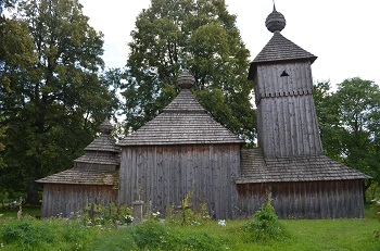 Arrêt à Jedlinka pour déjeuner devant la petite église en bois qui a un joli air penché.