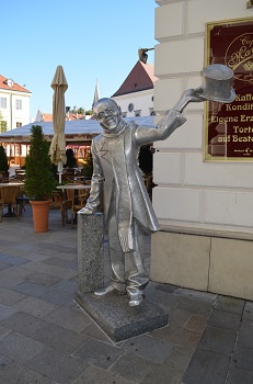 Nous allons tout d'abord nous procurer un plan à l'office de tourisme et commençons par la place du Palais primatial : Palais de style classique achevé en 1781 pour l’archevêque Jozef Bathyány. Elle est décorée de nombreuses statues et de tapisseries du XVIIe siècle. On peut visiter la salle des glaces où fut signée la Paix de Pressbourg en 1805 suite à la bataille d’Austerlitz, et juste derrière l'Hôtel de ville. Ce sont de très beaux bâtiments, plein de charme. La place est très agréable et calme. La cour de l'hôtel de ville est le joyau de la ville : les murs sont blancs, les bois noirs avec des balcons, des arcades.